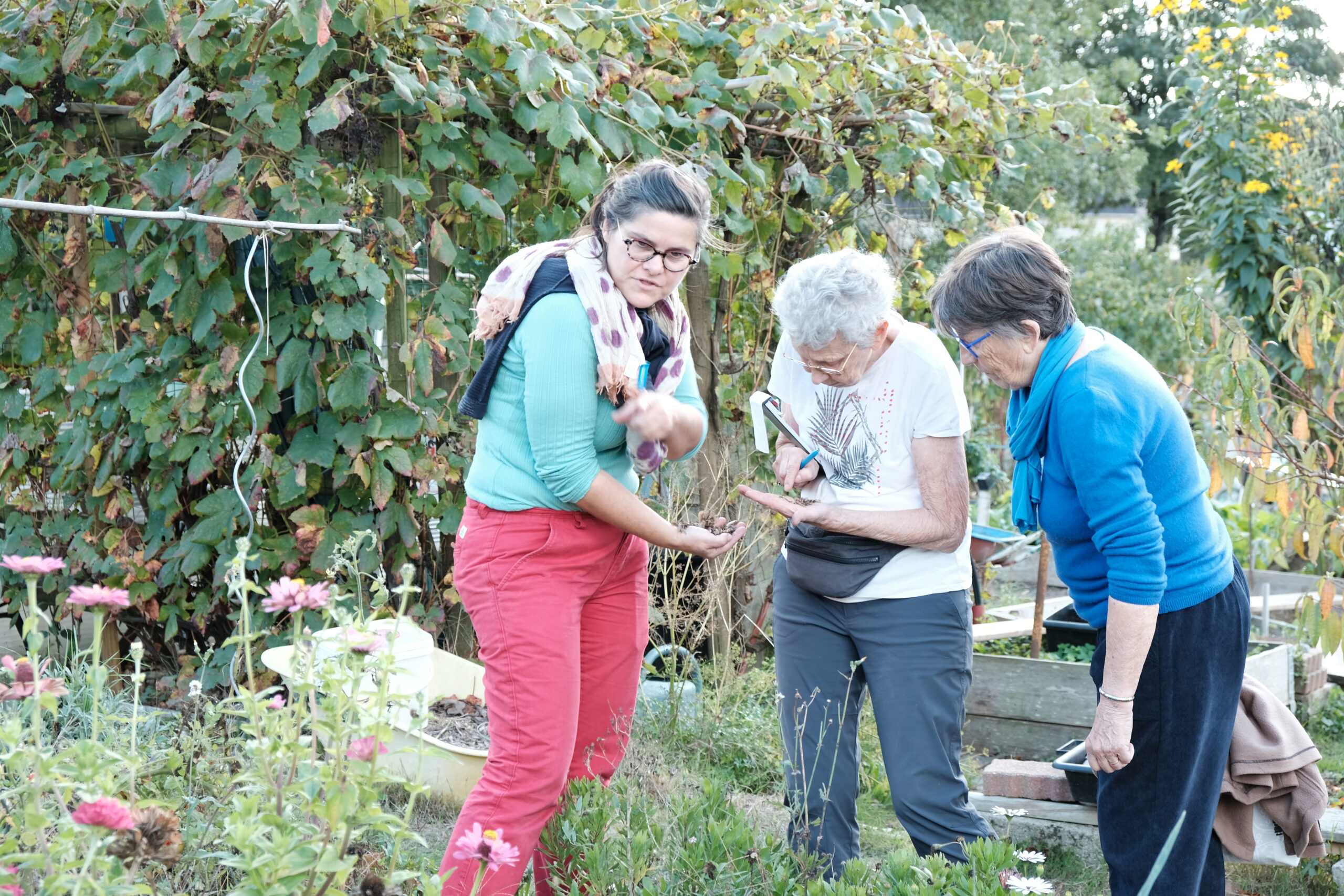 Pour Catherine, cette formation est importante car elle l’oriente « vers les bonnes pratiques grâce à l’intervention de personnes passionnées et riches de savoirs. Ce type de formation permet de faire changer les mentalités pour faire évoluer les pratiques comme le paillage et l’amendement des sols. Ce qui est chouette aussi, c’est le partage de graines et de plants, ce sont les coups de main, c’est intergénérationnel et c’est super sympa ». Pour les deux amies, le jardinage est une manière de décompresser et est source de bien-être.