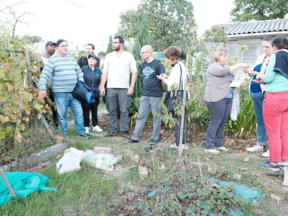 Ce samedi après-midi de début octobre, les jardins familiaux respirent la tranquillité du début de l’automne. Au bout des parcelles, entre les branchages d’un mûrier et quelques vignes, une quinzaine de personnes déambulent entre les jardins accompagnées d’un jeune formateur d’Environnements solidaires. Gavin Durox encadre cette séance sur le thème du paillage du sol, du broyage de déchets verts et de la taille des arbres. « Dans le jardin rien ne se perd, tout se réutilise » : par cette phrase répétée plusieurs fois, le jeune homme affirme la logique du cercle vertueux du recyclage. Cette séance fait partie du cycle de formations organisé par la Ville destiné aux membres (volontaires) de l’association des jardins familiaux. « Cette formation permet aux jardiniers de se sentir soutenus et accompagnés dans leurs pratiques de jardinage. C’est avant tout du contact humain où chacun peut prendre la parole de façon informelle pour poser ses questions et faire part de sa pratique. On visite le jardin, chacun nous présente sa parcelle, ça nous permet d’avoir des exemples pour aborder tous les sujets ». Au cours de l’année, d’autres formations ont eu lieu autour de la permaculture, du compostage, du lombricompostage, du soin des plantes et des insectes auxiliaires.