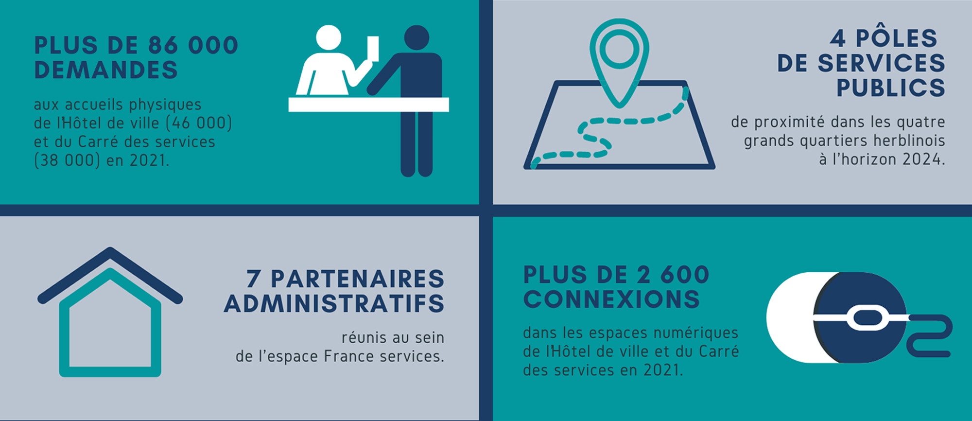 Situé au 2e étage du Carré des services, . Il regroupe dans un même lieu 7 partenaires administratifs : services des Impôts, CARSAT (retraites), CPAM, Caf, Pôle emploi, Point justice (accès au droit) et Ministère de l’Intérieur (cartes grises). Labellisé par l’État, l’espace France services repose sur un partenariat fort avec la Ville, comme l’explique Christian Tallio : « La Ville s’investit pour faciliter la vie des Herblinoises et Herblinois : nous avons mis à disposition les locaux et 5 agents municipaux ont été formés pour pouvoir renseigner le public sur les prestations de base proposées par nos partenaires. » Une pierre de plus à l’édifice d’un service public municipal en phase avec les besoins des habitantes et habitants.
