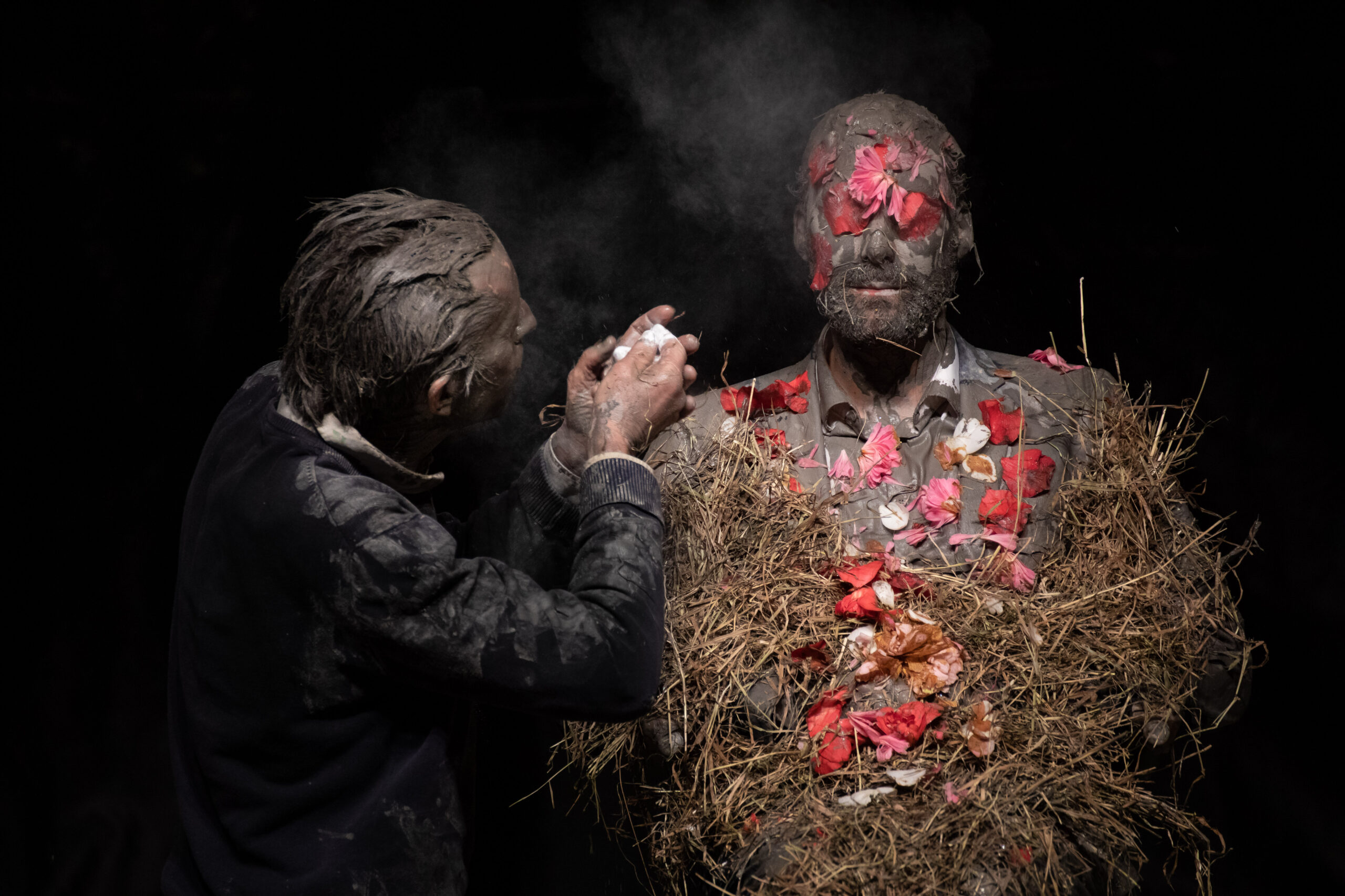 L'écrivain David Wahl et le sculpteur-performueur Olivier de Sagazan ont imaginé une pièce déroutante sur les métamorphoses © Erwan Floch